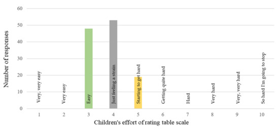 The study also used a scale to assess the intensity of physical effort during the IVGs sessions (Figure 2). It is a scale that graphically depicts the level of physical effort experienced by the participants. The CERT scale is recommended for children due to reproducibility and a simple and understandable graphic design [35]. Moreover, other stages of the scale adequately represent the level of physical effort, and the results adequately correlate with heart rate and oxygen uptake [35,36].