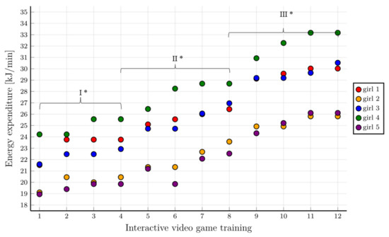 Energy expenditure in the following training stages for individual girls with consideration given to individual training phases. * First level of difficulty of the game—70% HRpeak; second level of difficulty of the game—75% HRpeak; third level of difficulty of the game—80% HRpeak.