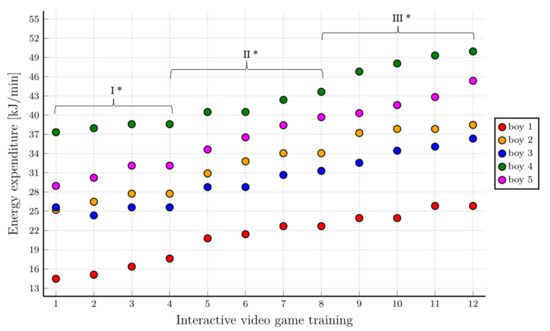 Energy expenditure in the following training stages for individual boys with consideration given to individual training phases. * First level of difficulty of the game—70% HRpeak; second level of difficulty of the game—75% HRpeak; third level of difficulty of the game—80% HRpeak.