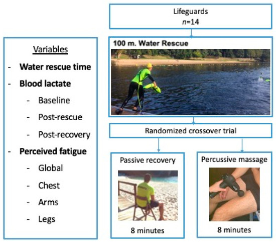 A quasi-experimental crossover design was carried out in order to analyze the effects of PMT on lifeguards’ recovery after a water rescue, in comparison with a passive recovery. Specifically, the recovery variables selected were perceived fatigue and blood lactate clearance, according to previous studies [6,7]. The design and the intervention are detailed in Figure 1.