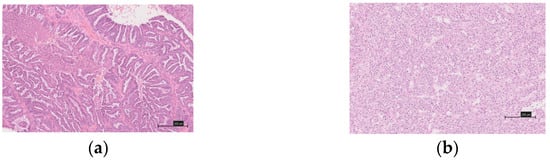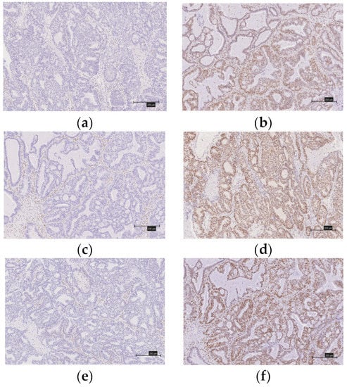 This study evaluated 91 cases of ovarian carcinoma (52 clear cell carcinomas, 39 endometrioid carcinomas), which had received treatment between April 2008 and December 2018 at the Department of Obstetrics and Gynecology at the Shimane University Hospital and the Seirei Hamamatsu General Hospital. The tissues were formalin-fixed, paraffin-embedded tissue blocks. A pathologist diagnosed a sample stained with hematoxylin and eosin (Figure 1a,b). Ovarian cancer was staged according to the 2014 International Federation of Gynecology and Obstetrics (FIGO) guidelines [20]. The histological diagnoses were made in accordance with the 2014 World Health Organization (WHO) classification of ovarian cancer [21]. Clinical data were collected from the patient charts. The follow-up period ranged from 4 to 128 months, with a median follow-up of 57 months.