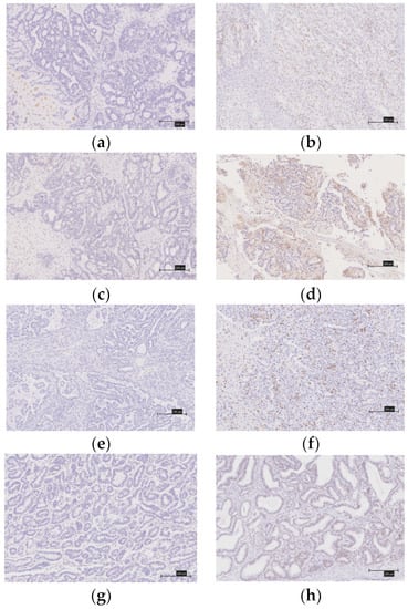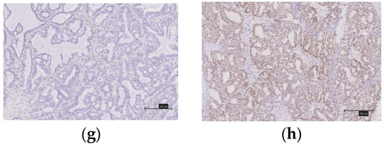 We evaluated the expression of the MMR proteins (MSH2, MLH1, MSH6, and PMS2), immune checkpoint molecules (PD-1 and PD-L1), CD8 lymphocyte infiltration in the tumor, and the ARID1A using immunohistochemistry (IHC) (Figure 2a–h and Figure 3a–h). The tissues were formalin-fixed, paraffin-embedded tissue blocks. They were sliced from the block to a thickness of 4 μm. We used antibodies against the MutS protein homolog 2 (MSH2, 1:50; Dako, Santa Clara, CA, USA), MutL protein homolog 1 (MLH1, 1:50; Dako), MutS protein homolog 6 (MSH6, 1:40; Dako), PMS1 homolog 2 (PMS2, 1:40; Dako), mouse monoclonal antibody [NAT105] to PD1 (NAT105, 1:100; Roche, Basel, Switzerland), rabbit monoclonal to PD-L1 (SP263, 1:100; Roche), and monoclonal mouse anti-human CD8 (SP57, 1:100; Dako).