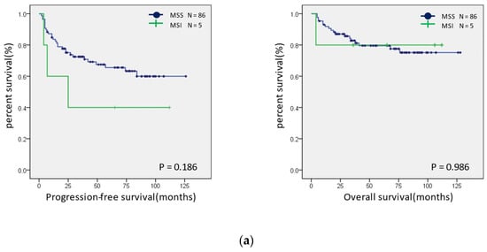 We divided the cases into the MSI-H and microsatellite stable (MSS) groups, and their associations with each clinicopathological and immune checkpoint factor was evaluated using the chi-squared test. In addition, we performed univariate analyses for progression-free survival (PFS) and overall survival (OS). PFS was defined as the period from the first treatment date to the recurrence date or the last follow-up date. OS was defined as the period from the first treatment to the death date or the last follow-up date. A survival analysis was performed for the PFS and OS and expressed as a Kaplan–Meier curve. The log-rank test was used to determine the statistical significance. In this study, we defined p-values below 0.05 as statistically significant. IBM SPSS Statistics for Windows, version 27 (IBM Corp., Armonk, NY, USA) was used for the data analysis.