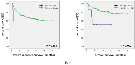 Survival curves were created for the PFS and OS of patients with MSI-H and MSS (Figure 5a). Neither group showed significant differences; however, in the ovarian endometrioid and clear cell carcinomas, the PFS tended to be better in the MSI-H group. In addition, a similar analysis was performed for the presence or absence of the expression of CD-8, PD-1, PD-L1, and MMR proteins. The OS was shorter in patients with a PD-L1 expression than in those without a PD-L1 expression (p = 0.022) (Figure 5b). There were no significant differences in the expression status of CD8, PD-1, MMR, and ARID1A (Figure S1).