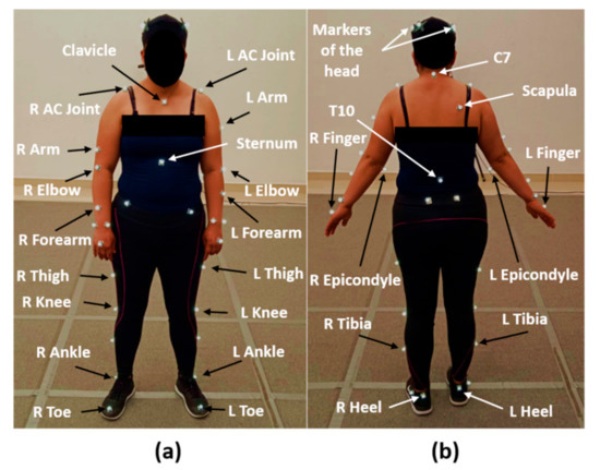 Placement of the markers in specific bony landmarks: (a) anterior view and (b) posterior view. R and L, the right and left sides of the evaluated volunteer.