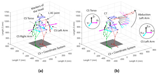 Once the evaluations were completed, data processing continued in the Vicon Nexus software (Nexus version 2.8.1.111866h x86), where the 41 reflective markers placed on the participants were labeled. Next, the data were exported to MATLAB R2015a software (version 8.5.0.197613, The MathWorks Inc., Natick, MA, USA), in which three orthogonal coordinate axes systems were created (Figure 2a). The first coordinate system (CS) was created with markers of the torso (the mathematical procedure is explained through Equations (1)–(6), the second one was created with markers of the left arm (Equations (7)–(12)), and the last one was created with markers of the right arm (similarly to the CS of the left arm).