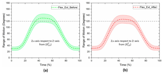 Figure 3 shows the kinematics of the vertical axis ( axis) of the affected arm with respect to the vertical axis of the torso ( axis). Moreover, Figure 3 shows the trajectory of the glenohumeral joint of the affected arm during the flexion–extension movement before and after mastectomy. In Figure 3a, the mean and standard deviation of the 15 participants before the breast cancer surgery are presented, while Figure 3b shows the mean and standard deviation of the same participants after mastectomy.
