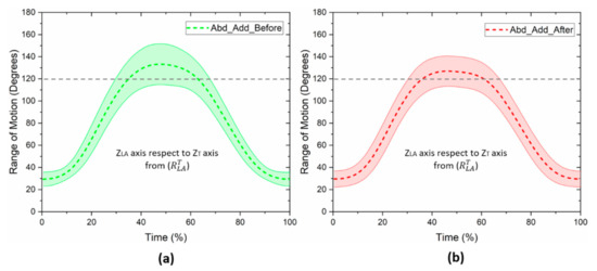 In Figure 4, the kinematics of the glenohumeral joint of the affected arm during the abduction–adduction movement, before and after mastectomy, is presented. An average range of motion of 106.5 ± 20.5 degrees was obtained before breast cancer surgery (Figure 4a), and 96.4 ± 16.9 degrees after mastectomy, respectively (Figure 4b). Although there was a reduction in the range of motion after the surgery, the results of Student’s t-test for paired samples did not show a significant difference for both kinematic evaluations (p = 0.058). However, the results are shown at the limit of statistical significance.