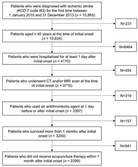 The study population in this retrospective cohort study comprised patients with subacute and chronic ischemic stroke. Patients diagnosed with ischemic stroke (Korean Classification of Diseases, Seventh Revision; code I63) for the first time between January 2010 and December 2013 (n = 10,865) were selected. In the dual medical system in South Korea, physicians who practice KM and those who practice Western medicine diagnose and treat patients separately; furthermore, these physicians used different diagnostic codes before 2010. Therefore, data before 2010 were excluded. Moreover, we determined that the follow-up period required to observe long-term outcomes should be at least two years [21]. Accordingly, patients with ischemic stroke were included up to 2013. Patients were included if they were 40 years or older at the time of stroke onset (n = 10,634) and hospitalized for at least 1 day after stroke onset (n = 4170).