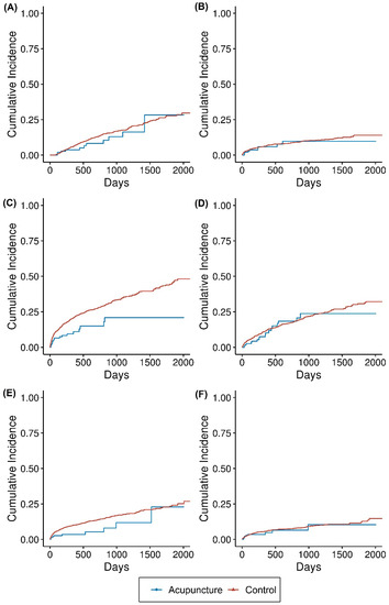 During the follow-up, the incidence of all-cause death was 13.6/100,000 person-days in the acupuncture group and 25.7/100,000 person-days in the control group. The incidence of readmission was 11.0/100,000 person-days in the acupuncture group and 13.1/100,000 person-days in the control group. The incidences of composite complications were 35.7/100,000 person-days in the acupuncture group and 55.1/100,000 person-days in the control group. There was a lower incidence of distinct complications in the acupuncture group than in the control group (Table 2). The cumulative incidence is presented in Figure 2.