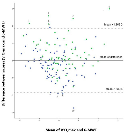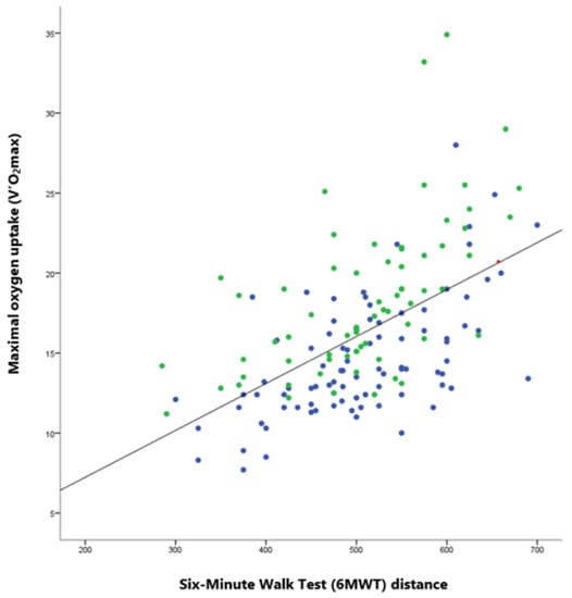 - Casanova, C.; Celli, B.R.; Barria, P.; Casas, A.; Cote, C.; de Torres, J.P.; Jardim, J.; Lopez, M.V.; Marin, J.M.; Montes de Oca, M.; et al. The 6-Min Walk Distance in Healthy Subjects: Reference Standards from Seven Countries. Eur. Respir. J. 2011, 37, 150–156. [Google Scholar] [CrossRef] [Green Version]