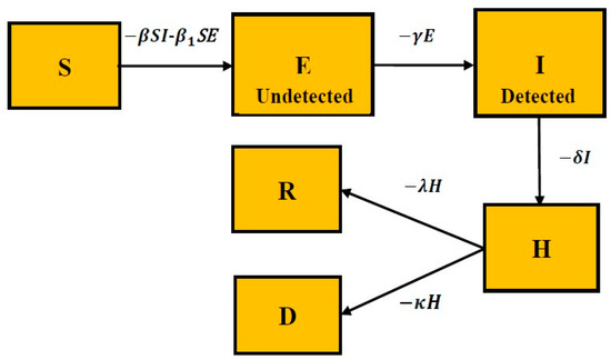 The discrimination between diagnosed and not-diagnosed individuals is essential in the highly infectious COVID-19 disease because the diagnosed individual is quarantined and is less likely to spread the disease. It also employs two different transmission rates (β and β1, both dependent on governmental policies) for diagnosed and non-diagnosed individuals. The Indian COVID-19 data drive the addition of the new Hospitalized compartment. The number of confirmed active cases in the Indian COVID-19 data are all those that are hospitalized. The relations between all these states are pictorially represented in the form of a diagram as shown in Figure 1.