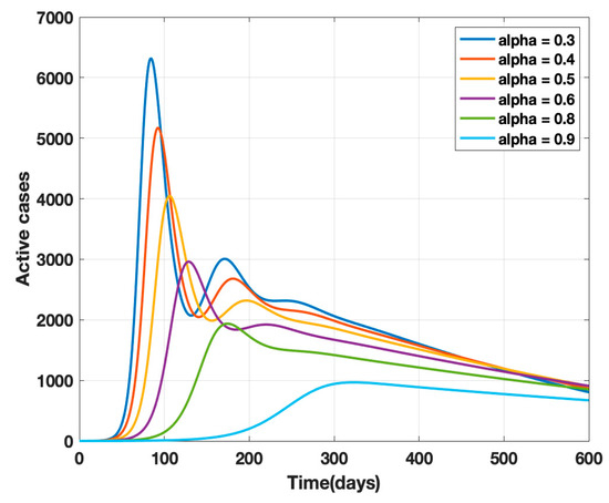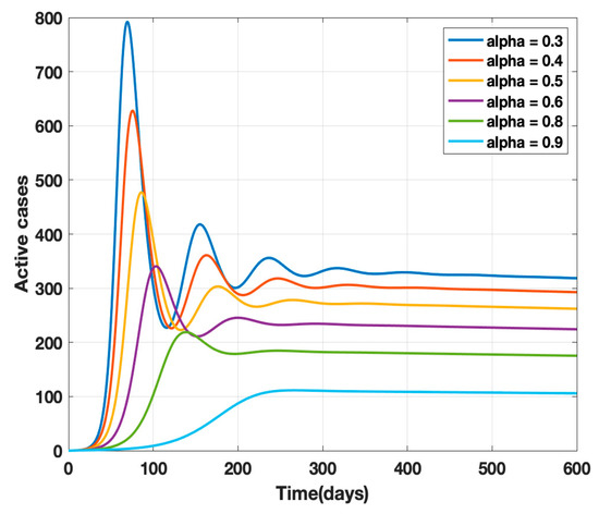 where κ is the mortality rate and ρ − 1 is the mean period of the impact of the number of deaths on the public, i.e., the factor controlling the strength of public perception. The transmission rates β and β1 are replaced by β(t) given by Equation (4) in the proposed model (1) and a sensitivity analysis of α (governmental policy action) and k (strength of public action) is carried out as shown in Figure 2 and Figure 3. It is observed from the analysis that to combat the pandemic, both governmental policy actions and public perception of risk are required. Further, the early approach of the peak or delaying the peak depends on the healthcare capacities and management capabilities of a densely populated country such as India. For example, it was found empirically that when both governmental control measures (α = 0.8) and a fair strength of public perception of risk (k = 1000) exist, the curve for the daily active cases will flatten out around 200 days from the start of the epidemic, as shown in Figure 4. The main objective behind such an analysis was to contribute to the conceptual understanding of the proposed mathematical model and to demonstrate the extent of impact of government policy measures and public perception of risk on the progress of the highly infectious disease COVID-19.