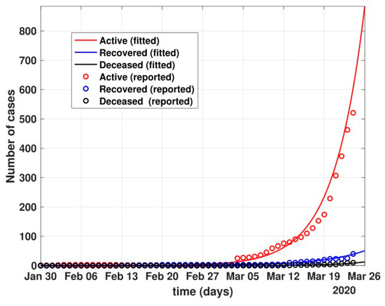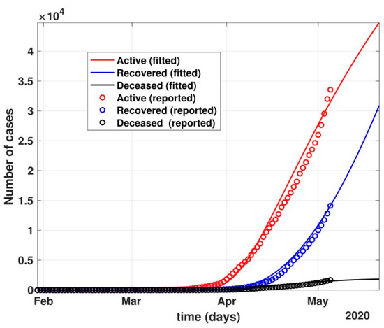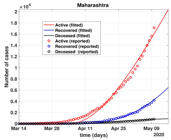 Time-series datasets are collected for the real-time prediction of COVID-19 cases for India. Daily confirmed cases from 30 January through 11 May 2020 are considered for fitting the model. Public data were obtained from the source https://www.COVID19india.org/ (accessed on 12 May 2020) [50] and correspond to the Confirmed cases, Recovered cases, and Deceased cases. The model was fitted in a nonlinear approach by calculating the normalized least-squares error of the model approximations and the active infected reported cases. The fitted parameters are summarized in Table 4.