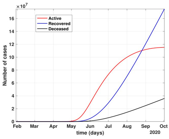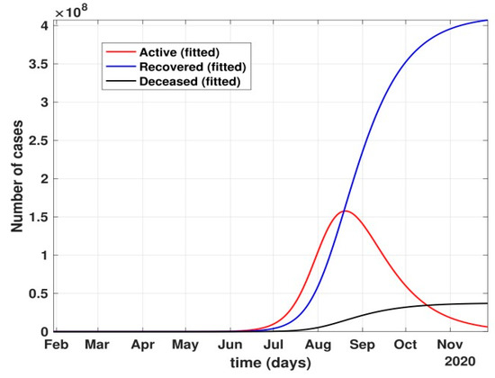 - Between 24 March and 4 May 2020, a time of two consecutive strict lockdowns in the country, there was a steady growth in the total number of active cases. When these data were fitted to the proposed model described in system (1) (shown in Figure 7), the curve of cumulative active cases intersected the curve of recovered cases in June 2020 and started further flattening, as is visible in Figure 8.