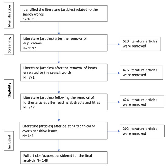 Based on Google, Google Scholar, PubMed, Science Direct, Web of Science and Scopus, a total of 1825 relevant articles were identified. However, more than 600 (628) duplicates were identified and these were deleted. Moreover, literature that was not closely related to the search words led to the deletion of a further 426 articles. At this stage, 771 articles had been considered for assessment. After careful consideration of the titles and abstracts, a further 424 articles were removed. At this stage, 347 articles had been considered for the analysis. After reading these 347 papers, a further 202 articles were deleted, as they had either highly technical or overly sensitive issues. Finally, 145 papers were considered for the study. Of these 145 papers, Table 2 presents the top 10 papers, which are the most relevant and highly cited articles. Figure 1 provides information on the inclusion and exclusion criteria of the literature.