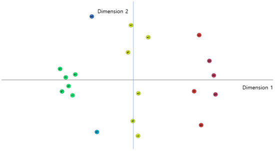 In the case of the expert evaluation mode, the result of the MDS plot is displayed in Figure 3. Each coordinate in two dimensions is illustrated in Table 6. The statistics for goodness of fit are as follows: standardized circle stress; 0.0567; explained dispersion: 0.944; and Tucker’s coefficient of congruence: 0.971. This means that model fitness is 0.971, and 97% of the variation can be explained in two dimensions. The result of the GMA derived from the mode of expert evaluation (Table 7) is similar to that derived from the mean of expert evaluation.