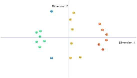 GMA requires the resetting of complex multi-dimensional data, which is accomplished by reducing them to several simple dimensions. At the same time, it must include information derived from the original data to the greatest extent possible. Therefore, in order to reduce the quantity of data involved, various scaling or reduction tools can be applied to GMA, including principal component analysis, factor analysis, multi-dimensional scaling, cluster analysis, and semantic mapping. In this study, we applied multidimensional scaling (MDS) to GMA. This is a generalized method that identifies concealed structures by simplifying complex variable information. This operation categorizes variables into only a few dimensions and demonstrates the relationships between them. In this way, researchers can demonstrate latent similarity and dissimilarity among entities [39]; that is, the method is used to discover meaningful underlying dimensions and to reveal latent structures by simplifying variable information.