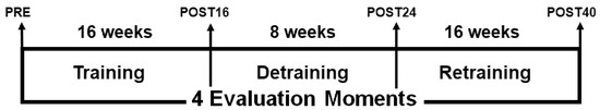 The intervention consisted of a first period of sixteen weeks of resistance training with elastic bands, followed by eight weeks of detraining and a second training period of sixteen weeks. Participants performed a total of 64 sessions, 2 sessions/week of 45 min each on non-consecutive days distributed between the two training periods.