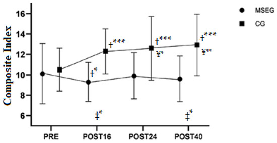 In relation to the composite index, we found a main effect of group (F1,25 = 7.80, p = 0.010), moment (F3,399 = 15.15, p < 0.001) and interaction of group by moment (F3,399= 31.75, p < 0.001). Estimated difference between MSEG vs. CG was −2.35 a.u. (95%CI [−4.0 to −0.7]), p = 0.010), and the difference between groups (i.e., MSEG vs. CG) in changes of POST16 vs. PRE (β = −2.6, 95%CI = −3.3 to −1.9, p < 0.001), POST24 vs. PRE (β = −2.4, 95%CI = −3.0 to −1.7, p < 0.001) and POST 40 vs. PRE (β = −2.9, 95%CI = −3.6 to −2.3, p < 0.001) indicate lower composite index in MSEG than CG during the entire intervention. Mainly, CG progressively increased their composite index throughout the intervention period (Table 3 and Figure 2).