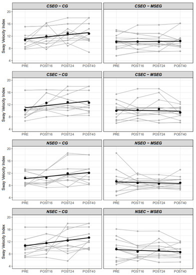 We also observed that the CG presented a substantial increment of their sway velocity composite index (17.1%) at POST16, when on the other hand, MSEG presented a 7.9% decrease of sway velocity composite index, indicating an improvement in the estimated risk of falls after that period. A similar pattern was observed in the postural control (in the four conditions (Figure 3), with the CG always showing a worsening trend when compared to the MSEG. It has to be emphasized that MSEG trained resistance exercise with elastic bands for two sessions per week, with similar training configurations producing similar results, showing that groups who performed physical exercise demonstrate a trend to decrease de fall risk by improving their balance [24,57].
