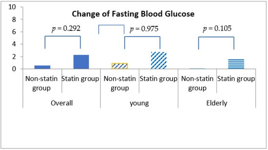 Changes in fasting blood glucose levels among non-statin and statin users overall and in young and elderly cohorts after propensity score matching.