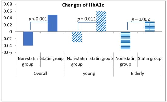 In the overall cohort, after treatment, statin users (−0.03 ± 0.98%) had a 50% lower level of HbA1c (−0.02 ± 0.82%), a 21.2% lower insulin level and a 13.4% lower level of HOMA-IR than non-statin users (all p < 0.05) (Table 2). These significant variances were also observed in the subgroup of elderly patients. However, in young patients, statin users (−0.02 ± 1.06) only had a more significant reduction in serum level of HbA1c than young statin non-users (−0.00 ± 0.79) (p < 0.001).