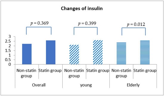 Changes in serum insulin level among non-statin and statin users overall and in young and elderly patients after propensity score matching.