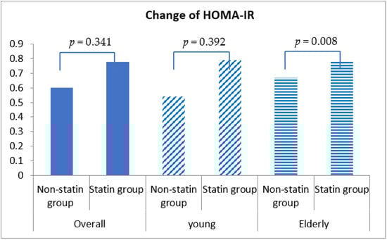 Changes in homeostasis model assessment insulin resistance (HOMA-IR) index among non-statin and statin users overall and in young and elderly patients after propensity score matching.