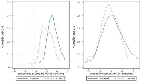 The homogeneity of the experimental and control groups was established after PSM was confirmed using the graphs in Figure 1. As Figure 1 and Table 1 show, both groups, i.e., the experimental and control groups, had a relatively similar shape after PSM, which means that they had comparable results to those of the PSM.