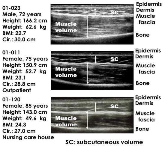 Ultrasonic echogram was taken from all participants, and typical ultrasonic echograms are shown for different age groups: 72-year-old male, 75-year-old female outpatient, and 85-year-old female bedridden in a nursing home in Figure 1. The thickness of the epidermis, subcutaneous tissue, and muscle volume were measured at different ultrasonic intensities.