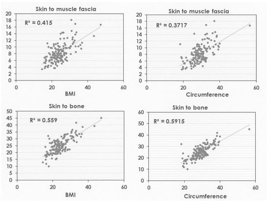 Correlations between the depth to the muscle surface or the bone and BMI or circumference of the deltoid muscle area were investigated, and the results are shown in Figure 2. Depth from the skin surface to muscle fascia was not correlated with BMI or circumference, but that to bone was correlated with the circumference around the deltoid area.
