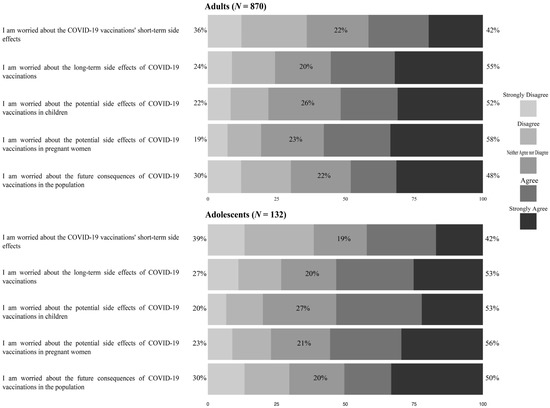 Based on the factor analysis with oblique rotation (Promax), the worry scale consisted of a single underlying factor. The Cronbach’s alpha for the scale was 0.91. The mean score for COVID-19 vaccine worry among adults (n = 870) was 12.2 (SD = 5.7). Of the adults in the study sample, 57.8% either agreed or strongly agreed with the statement, “I am worried about the potential side effects of COVID-19 vaccinations in pregnant women”; 52% either agreed or strongly agreed with the statement, “I am worried about the potential side effects of COVID-19 vaccinations in children”; and 48% either agreed or strongly agreed with the statement, “I am worried about the future consequences of COVID-19 vaccines on the population”. With respect to adolescents, the mean score for COVID-19 vaccine worry was 11.9 (SD = 5.4). Among the adolescents, 53.3% either agreed or strongly agreed with the statement, “I am worried about the potential side effects of COVID-19 vaccinations in children”; 55.5% either agreed or strongly agreed with the statement, “I am worried about the potential side effects of COVID-19 vaccinations in pregnant women”; and 53% either agreed or strongly agreed with the statement, “I am worried about the long-term side effects of COVID-19 vaccinations”. Figure 1: Worry scale regarding COVID-19 vaccines shows the results regarding adults’ and adolescents’ worry about COVID-19 vaccines.