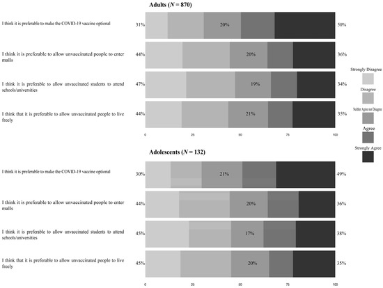 Figure 2 Participants’ opinion about COVID-19 restrictions for unvaccinated individuals displays participants’ opinions about COVID-19-related restrictions for unvaccinated individuals, stratified by age into adults and adolescents. Of the adults, 50% either agreed or strongly agreed with the statement, “I think it is preferable to make the COVID-19 vaccine optional”, but 47% either disagreed or strongly disagreed with the statement, “I think it is preferable to allow unvaccinated students to attend schools/universities”. Furthermore, 44% reported that they disagreed or strongly disagreed with the statements, “I think it is preferable to allow unvaccinated people to enter malls”, and, “I think that it is preferable to allow unvaccinated people to live freely”. Likewise, a large number (49%) of the adolescents either agreed or strongly agreed with the statement, “I think it is preferable to make the COVID-19 vaccine optional”, although 45% either disagreed or strongly disagreed with the statements, “I think it is preferable to allow unvaccinated students to attend schools/universities”, and, “I think that it is preferable to allow unvaccinated people to live freely”.