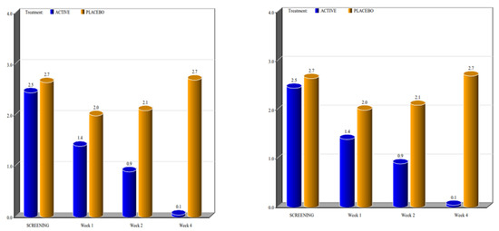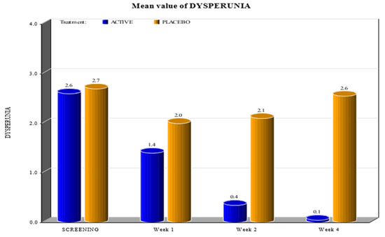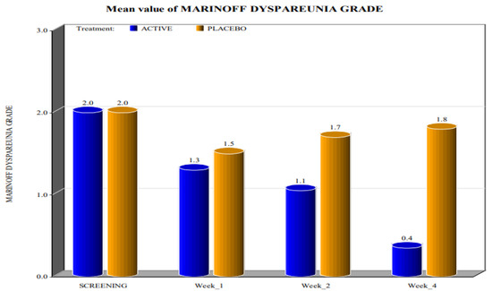 Concerning the levels of Marinoff dyspareunia, after the use of the active product, improvements were evident (Figure 6). At the screening time, both groups had dyspareunia of grade 2. By week 1, the subjects in the active group, as well as the subjects in the placebo arm, graded their dyspareunia as 1. The same result was recorded during week 2. However, during week 4, almost all subjects in the active group graded their dyspareunia as 0, whereas for subjects in the placebo arm, the levels of Marinoff dyspareunia returned to be similar to those at the screening visit (Table 3).