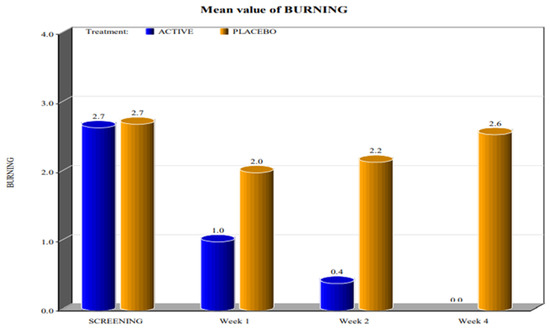 In the placebo arm, we noted a slight improvement in the first week of product use (probably due to the placebo effect), but these beneficial effects of the placebo disappeared after 4 weeks. These data confirmed that the active product significantly reduced itching, burning (with the complete disappearance of the symptom after 4 weeks), dyspareunia, erythema, and vulvar pain at the 5 o’clock and 7 o’clock positions when compared to the placebo.
