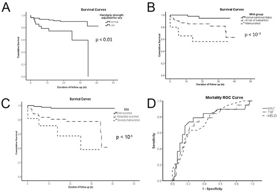 During the follow-up period, 18 patients died (12 men and 6 women), of which 7 and 5 were malnourished, according to MNA and SGA, respectively, and 2 were well-nourished according to both scores. The mortality rate at follow-up was 13%. Patients who died belonged to the decompensated cohort. The causes of death were sepsis (n = 6), heart failure (n = 4), hepatorenal syndrome (n = 3), hepatic coma (n = 2), variceal hemorrhage (n = 2), and infectious respiratory disease (n = 1). Figure 1 illustrates the Kaplan–Meier survival curves of cirrhotics per HGS group adjusted for sex (A); the MNA group (B); the SGA group (C); and mortality ROC curves per TSF, MAC, and MELD score (D). Analyzing survival per HGS group adjusted for sex showed that cirrhotics with low HGS had a higher risk of mortality. Analysis per MNA or SGA group revealed that survival also differed per nutritional status. ROC curves of TSF, MAC, and MELD scores presented no statistically significant differences. SGA could not be compared since it is an ordinal variable; thus, it cannot even mimic a scale metric, as the MELD score.