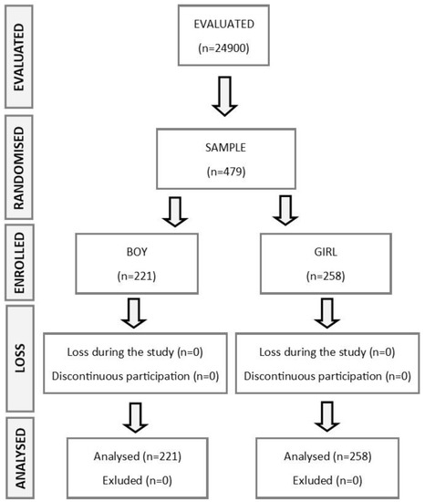 The required sample size of n = 479 students was calculated by establishing a confidence level of 95% and a margin of error of 5%, considering that the total number of students aged 6–12 years registered in the public schools of the provinces of Orense and Pontevedra was 24,900 students and assuming that, after the educational intervention, in the worst case scenario, only 50% of the students would show improvements.