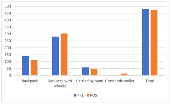 Descriptive analysis number and percentage (%) of the means of carrying school materials used by students pre- and post-intervention.