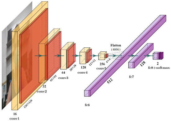 Figure 2 depicts the proposed CNN-based face-mask classification model that is suitable for any type of spatial data such as images. In this case, it accepted an RGB video frame with dimensions of , and used the first five convolutional layers to perform feature extraction and the remaining top layers for classification, as the final layer was two-way output using a softmax activation function. Each convolutional operation uses a kernel with no zero padding and stride of 1 followed by a maxpooling operation with a kernel size of and stride of 2. Thus, through these repeated operations of convolution and subsampling, the final convolutional layer generates 256 output feature maps with a spatial dimension of . It is then flattened and connected to a 512-neuron dense layer. The penultimate layer is also a dense layer with 128 neurons. Convolutional and fully connected layers (except the classifier layer) use ReLU as the nonlinear activation function. Thus, the model had a total of 983,330 trainable parameters (cf. Table 1). The model was trained for 5 epochs using a categorical cross-entropy loss function and the Adam optimiser with a batch size of 32. The model’s performance was compared to that of other pretrained architectures that were compatible with the acceleration hardware used in this study, and it is discussed in Section 5.