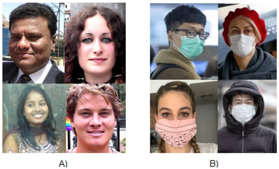 Sample images from dataset used in this study to train and validate the proposed model (A) without and (B) with mask.