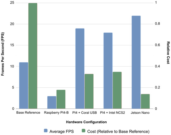 Experimental analysis included developing and testing multiple models with different hardware accelerations. Using a high-end desktop hardware and DL models, real-time face-mask detection and classification are easily achievable. However, these models are unable to perform in real time when operating on embedded hardware, i.e., resource-limited computational platform [24]. In this study, desktop-based implementation was the baseline. The desktop consisted of an Intel I7-8650U CPU 1.9 GHz, and 16 GB RAM with a retail cost of approximately USD 409 (CPU Product Specifications—https://ark.intel.com (accessed on 14 January 2022)), which is referred to as BaseCost. The performance of the accelerated MaskDetect models was then compared with the baseline implementation.