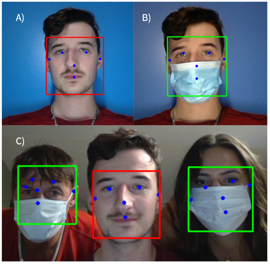 Face-mask detection is fundamentally intertwined with facial recognition due to their visual and technological overlap. The foundation laid by facial recognition technologies over the past decade can directly translate to the new implementations of face-mask detection. For example, Mercurio [8] utilises the MediaPipe framework and some of its prebuilt solutions for building models for this task. The MediaPipe framework allows for easy use and optimised machine-learning algorithms for a wide range of hardware. The authors chose the hand, face mesh, and pose solutions for the real-time processing of the input video feed. Chavda et al. [9] described the difficulties with manually tracking face-mask compliance and suggested a solution built on a multistage convolutional neural network (CNN) targeted for a specific CCTV camera. Their architecture was composed of two unique CNNs, one for face detection and one for mask classification. The authors noted that this approach allowed for them to build on high-performing pretrained face-detection models, such as Dlib [10] or RetinaFace [11]. Once a face is detected at the first stage, an intermediate process is carried out for region-of-interest (ROI) extraction along with image resizing and normalisation. Once image patches had been collected, the authors applied three preproduced classifiers to classify them as “mask” and “no mask”. A unique aspect of their approach is that their model classified cases such as improperly worn masks and hand-covering faces as “no mask” to achieve more accurate classification performance. Liu et al. [12] proposed a classifier based on a single-shot detector (SSD) architecture. While this construct suggests only one model, a more accurate description is explained as using the base model of VGG-16 for feature extraction and then truncating the model prior to classification. After this truncation, a variety of feature layers are added, and a custom model is built with MobileNetV2, ResNet50, and Xception for the final classification. Wu et al. [13] proposed a face-mask detection method to monitor whether people wear face masks in a right way in public.The feature extractor combined the Res2Net module and deep residual network to extract information from the input by utilising a hierarchical convolutional structure, deformable convolution, and nonlocal mechanisms. An enhanced path aggregation network (En-PAN) was applied for feature fusion. In addition, localisation loss was adopted in the model training phase, and the Matrix NMS method was used in the inference stage to improve detection efficiency. Song et al. [14] recommended a face-mask detection and facial-recognition system that supports mask position and type detection. The authors introduced a stacking ensemble model learning framework based on machine-learning feature extraction, deep-learning models, and transfer learning as key algorithm support for the developed system.