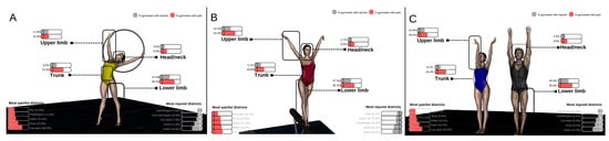 Prevalence of injuries and pain according to the anatomical district affected. (A) Male and female rhythmic gymnasts; (B) male and female artistic gymnasts; (C) all male and female gymnasts.