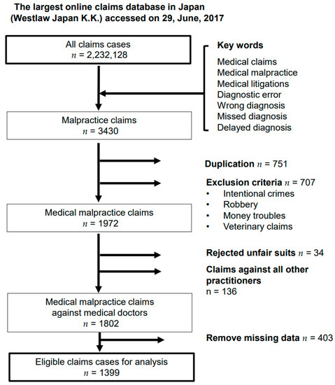 We extracted data on malpractice claims against medical doctors between January 1961 and June 2017 on 29 June 2017. We used the most extensive public database in Japan (Westlaw Japan Ltd.), which includes detailed clinical information such as full text and accurate precedents. Medical claims, medical litigation, medical malpractice, diagnostic errors, wrong diagnosis, missed diagnosis, and delayed diagnosis were among the preselected keyword combinations [19]. After developing and thoroughly considering the rules in advance, five reviewers, including a lawyer and an internal medicine physician familiar with medical malpractice, performed data extraction. Of all claims extracted based on the keywords, we extracted 3430 malpractice claims. After removing duplicates (n = 751), applying the exclusion criteria (intentional crimes, robbery, financial difficulties, and veterinary claims; n = 707), and rejecting unfair lawsuits and claims against all other practitioners (n = 170), we extracted 1802 medical malpractice claims against medical doctors in Japan. We excluded claims with missing data as follows: patient age had 339 missing cases; clinical outcome had 55 missing cases; specialized field had 35 missing cases; facility size had 22 missing cases; time zone had 3 missing cases; and place had 2 missing cases. The final analysis included 1399 malpractice claims (Figure 1).