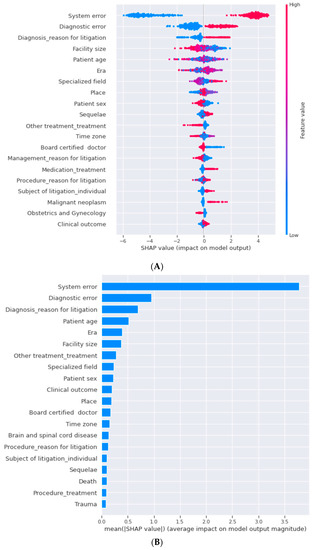 Feature importance in lightGBM with SHAP (A,B). The top five features important in lightGBM were system error, diagnostic error, the reason for litigation diagnosis, facility size, era, and patient age, in descending order.