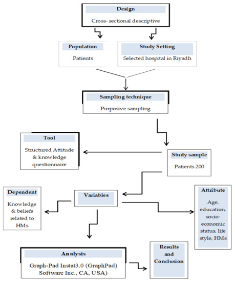 Two hundred patients who were receiving HMs by attending an outpatient clinic, hospital or follow-up in four government and private hospitals in the central region (Riyadh), Saudi Arabia, over a period of three months from April 2014 were invited to participate in the study. These hospitals were randomly selected for visits according to their location. An outline of the research design is shown in Scheme 1. The purpose and aim of the study were explained to the participants and their written informed consent was obtained. The study was conducted per the Declaration of Helsinki (2010) and in line with the rights and ethics for conducting human research accordingly. It was approved by the Ethics Sub-Committee of King Saud University (RRC-2014-008; dated 11 March 2014).