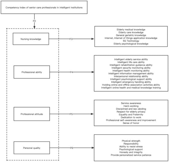 The competency model for intelligent institutional senior care professionals comprises four dimensions: nursing knowledge, professional ability, professional attitude, and personal quality.