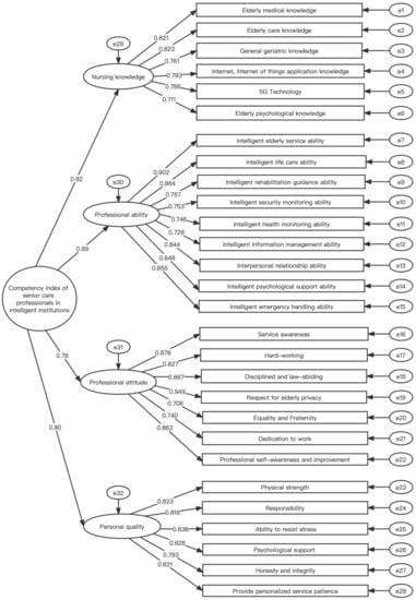 - It is established that a multidimensional hierarchical model of the competency of senior care professionals in intelligent institutions has a better fit than a unidimensional structural model. The results of the validation factor analysis verified that there is a high degree of matching between each competency element. The conclusion that the competency indexes of senior care professionals in intelligent senior care institutions constructed in this study are comprehensive and systematic is the same as in the results of current mainstream studies [23,24,25,26]. When establishing the competency index system, we should comprehensively consider various factors affecting competency quality and establish multidimensional structural indicators. It is more conducive to promoting the improvement of the competency quality of talents.