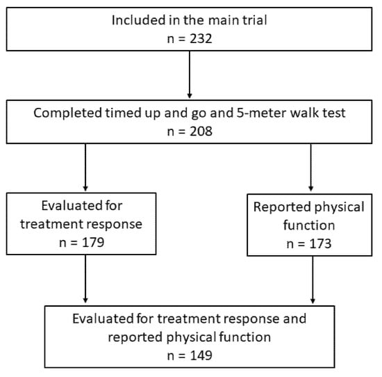 TUG was performed according to standardized guidelines [] and registered as the time the patient needed to stand up from a chair, walk 3 m (marked on the floor) at a comfortable pace, turn, walk back, and sit down again. Patients were permitted to use routine walking aids and were instructed not to use their arms to stand up. No physical assistance was given. The task was performed three times, and the average of performances two and three was included in the analyses.